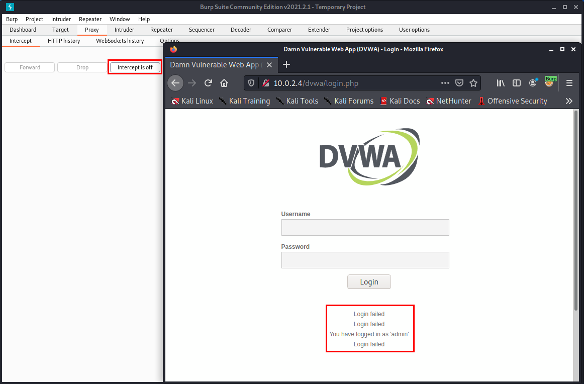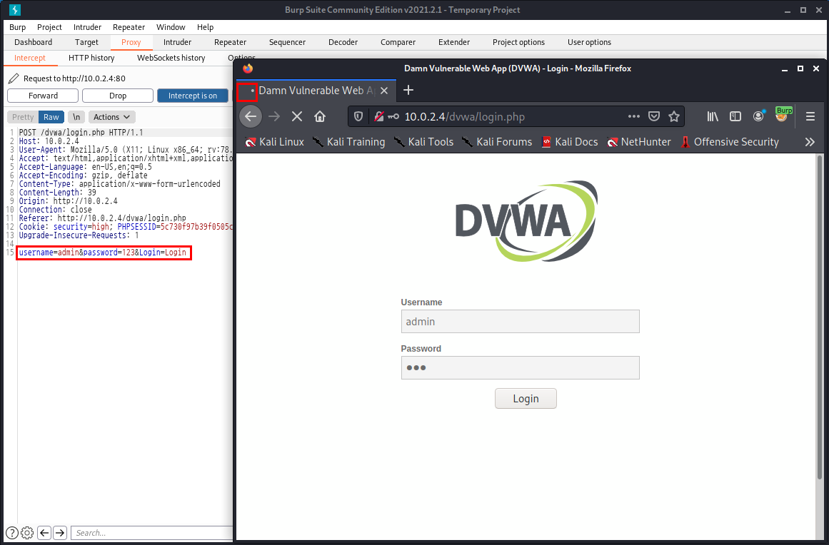 인터셉트가 켜져있기 때문에, 로그인 버튼을 누르면 DVWA 페이지는 무한 로딩이 시작되고, Burp Suite에서는 웹 브라우저의 DVWA가 전송한 데이터인 Username 에는 admin, Password에는 123이라는 데이터가 인터셉트에 걸린 것을 확인할 수 있습니다.