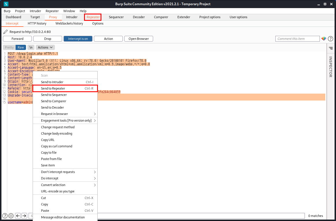 Burp Suite에서 인터셉트한 데이터를 다음 사진과 같은 방법으로 Repeater에 보내보겠습니다.