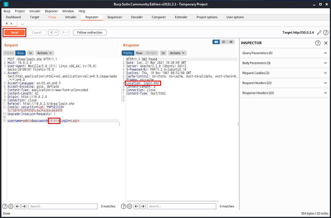 131313도 올바른 비밀번호가 아니기 때문에 Response에 똑같이 login.php가 돌아오며 로그인에 실패하였음을 알 수 있습니다.