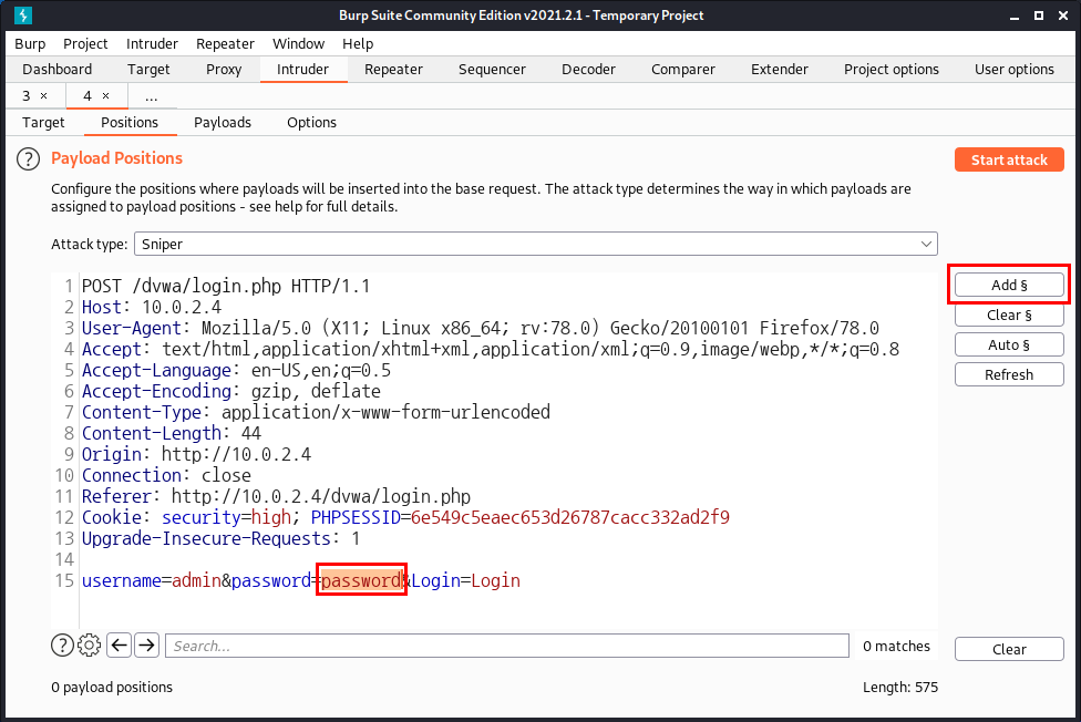 [Intruder] 기능으로 들어오면 "Target"에 현재 공격 대상인 DVWA의 Host 10.0.2.4와 Port 80을 확인할 수 있습니다.