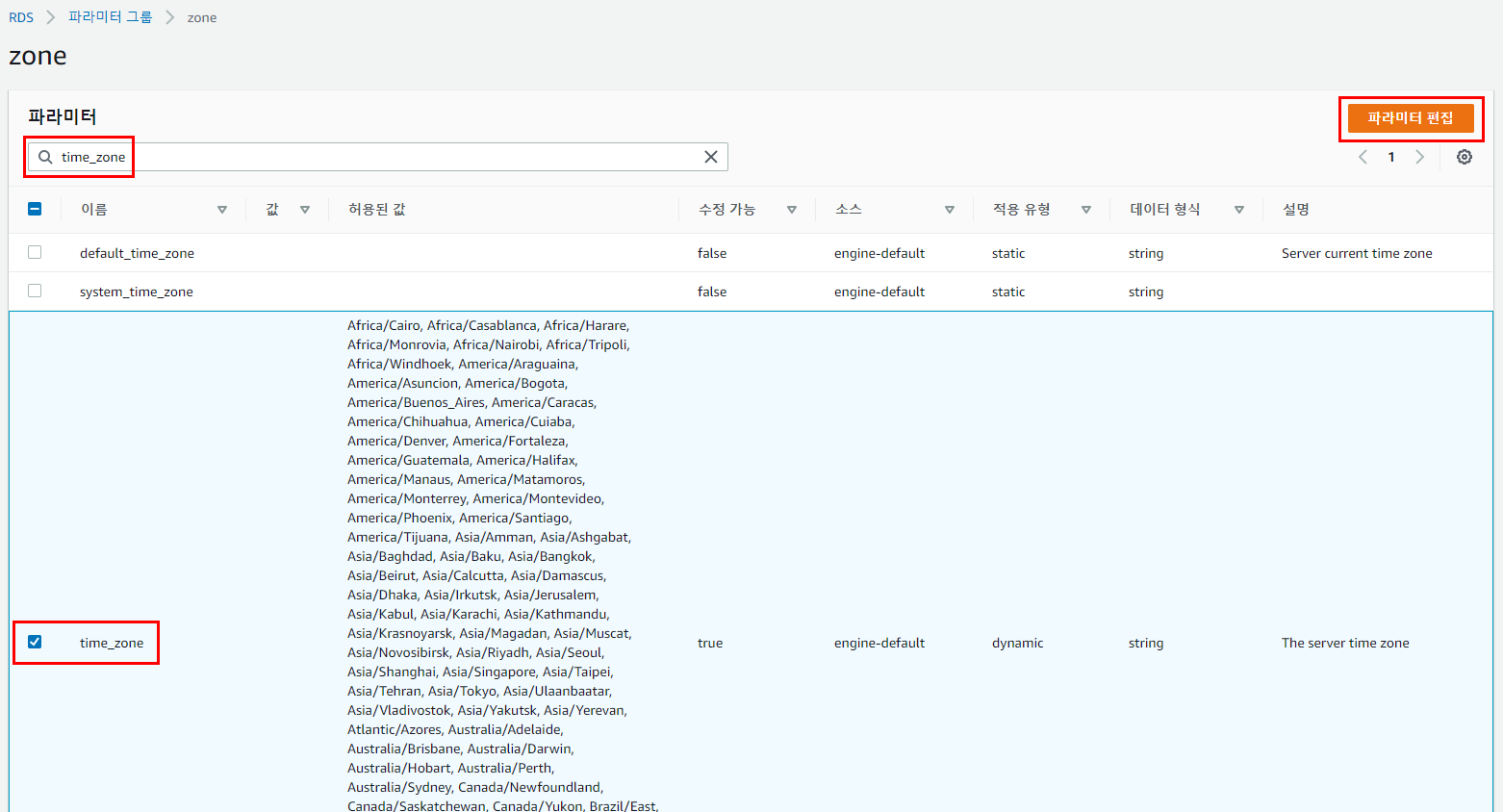 파라미터 검색창에 time_zone이라고 검색하면 다음과 같은 결과창이 로딩됩니다.