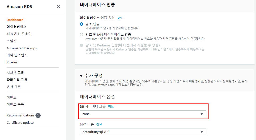 RDS 인스턴스의 수정을 할때, 스크롤을 내리다 보면 [추가 구성]의 데이터베이스 옵션에서 [DB 파라미터 그룹]을 방금 생성한 "zone" 파라미터 그룹으로 변경해 줍니다.