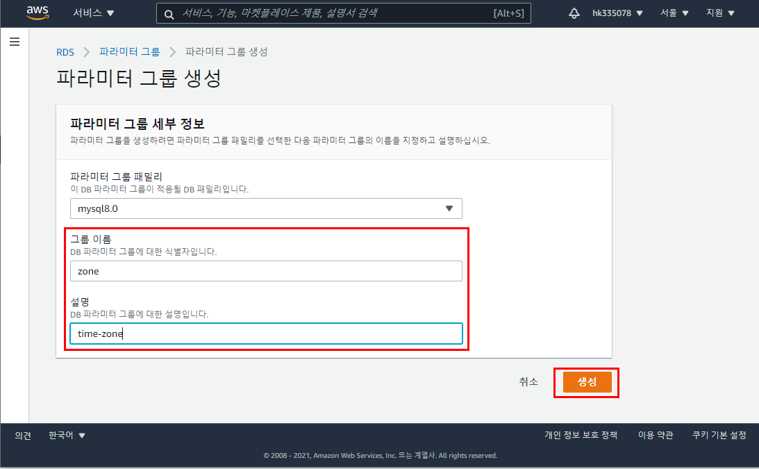 원하시는 그룹 이름과 설명으로 파라미터 그룹 생성을 해줍니다.