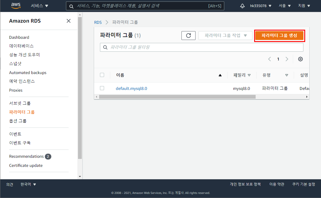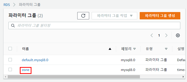 그럼 파라미터 그룹에 default 외에 저희가 생성한 파라미터 그룹이 생성된 것을 확인할 수 있습니다.