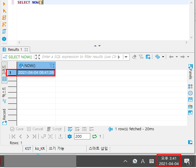 해당 SQL문의 실행 결과를 보면 "2021-04-04 06:41:26"이 결과로 나옵니다.