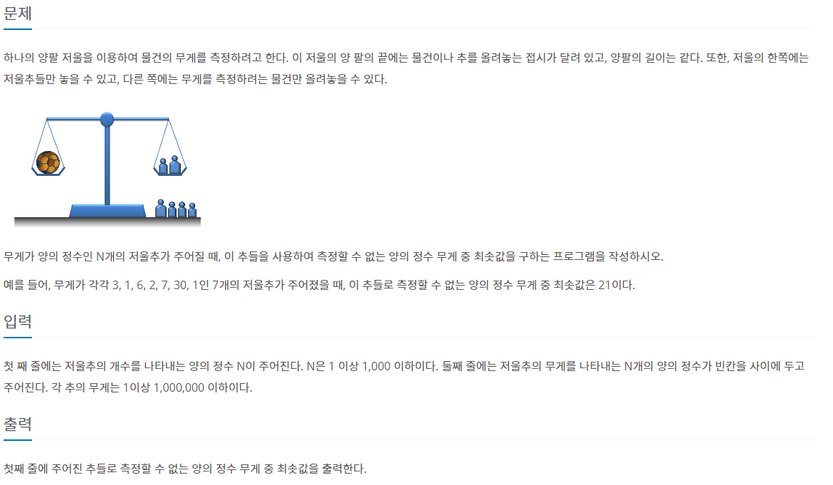 이 문제의 예제 입력인 3 1 6 2 7 30 1을 예로 들면 1 1 2 3 6 7 30으로 정렬하고, 1부터 누적합을 구해줍니다.