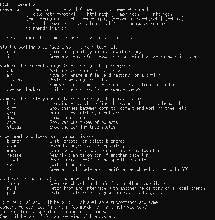 또 다른 명령어로 CMD에 "git --version"이라는 명령어를 치면 설치된 Git의 버전을 확인할 수 있습니다.