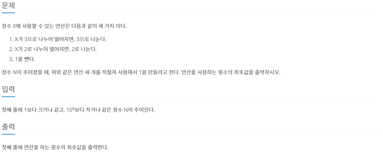 이 문제에서 테이블은 "D [i] = i를 1로 만들기 위해 필요한 연산 사용 횟수의 최솟값"이라고 정의할 수 있습니다.