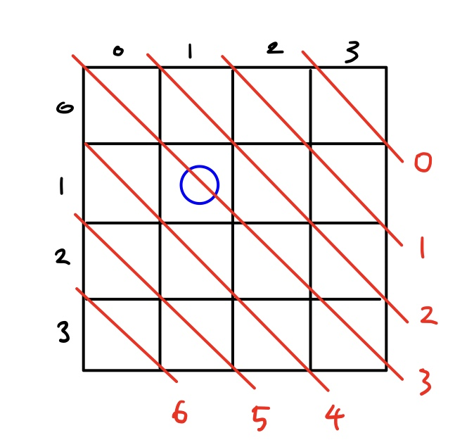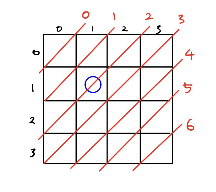 위 사진처럼, (1,1)에 퀸을 놓으면 (0,0), (2,2), (3,3)에는 퀸을 놓을 수 없습니다. (빨간색 숫자는 isused3 배열의 index)