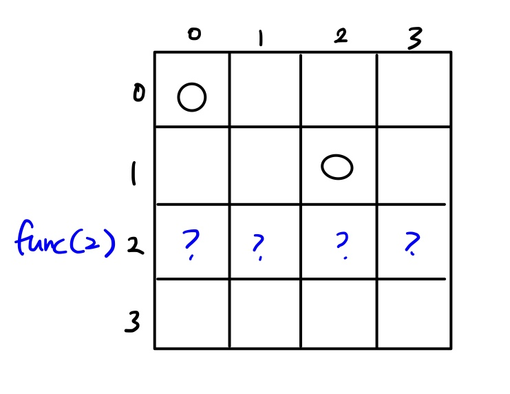 예를 들어 func(2)은, 퀸을 0번째, 1번째 줄에는 잘 놨고, 2번째의 어느 칸에 퀸을 놔야 할지 결정하는 함수입니다.