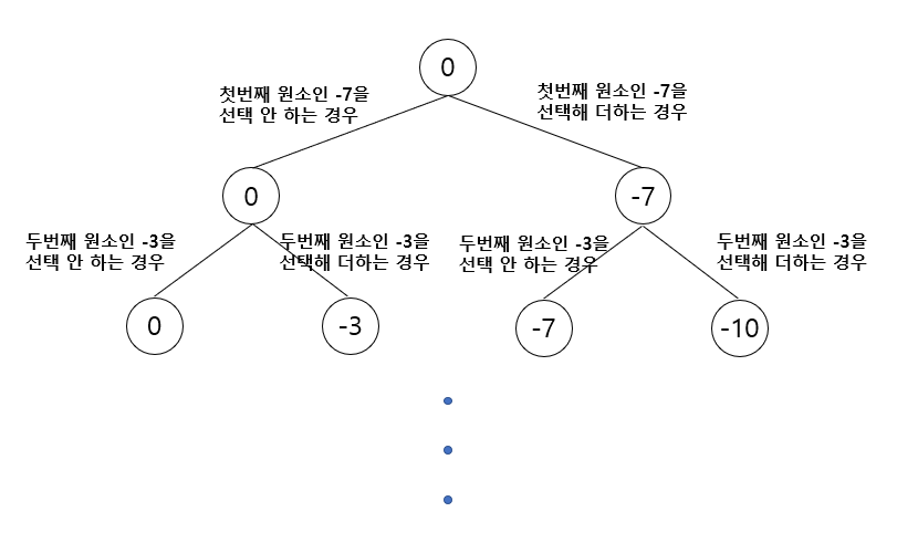 문제의 예제처럼 숫자가 [-7, -3, -2, 5, 8] 이 주어지면, 첫 번째 원소부터 총합으로 더할지 말지 선택하며 차례대로 뻗어나가는 알고리즘입니다.