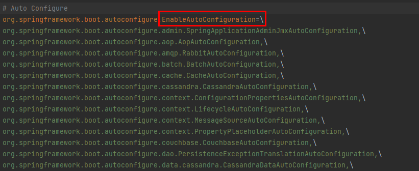 EnableAutoConfiguration을 키로 하는 외부 의존성들을 확인할 수 있습니다. 이 의존성들을 모드 스캔하며 조건에 따라 의존성을 주입해 줍니다.