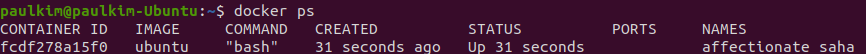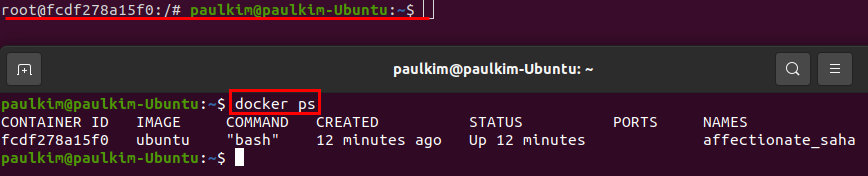 방금 실행한 ubuntu이미지 컨테이너가 실행 중인 것을 확인할 수 있습니다.