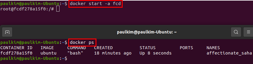 $ docker start -a [컨테이너 id]