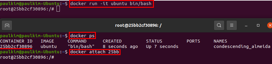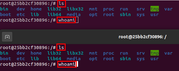 하나의 터미널 창에서 명령어를 입력하면, 같은 컨테이너에 접속해있는 터미널에도 똑같은 출력이 나타나게 됩니다.