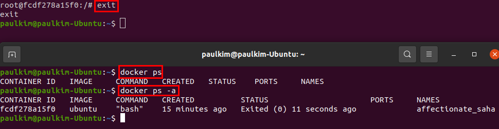 2. exit 명령어로 빠져나오고, $ docker ps 명령어를 통해 실행 중이 컨테이너가 없는 것을 확인하고, $ docker ps -a 명령어로 종료된 컨테이너를 확인할 수 있습니다.