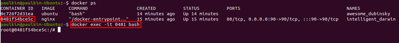 위에 docker ps 명령어를 통해 확인한 nginx컨테이너의 아이디는 0481f54bce5c임을 확인할 수 있습니다.