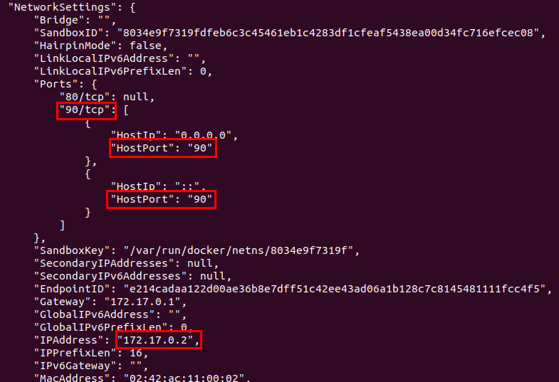 엄청 많은 정보와 함께 NetworkSettings 부분을 보면 설정해 준 90 포트와 ip주소를 확인할 수 있습니다.