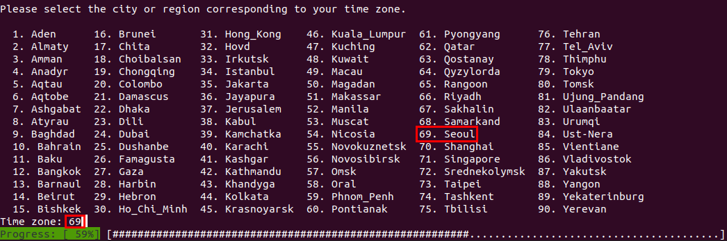 설치 도중 다음과 같은 설정을 해줘야 하는데, Asia, Seoul을 선택해 주면 됩니다.