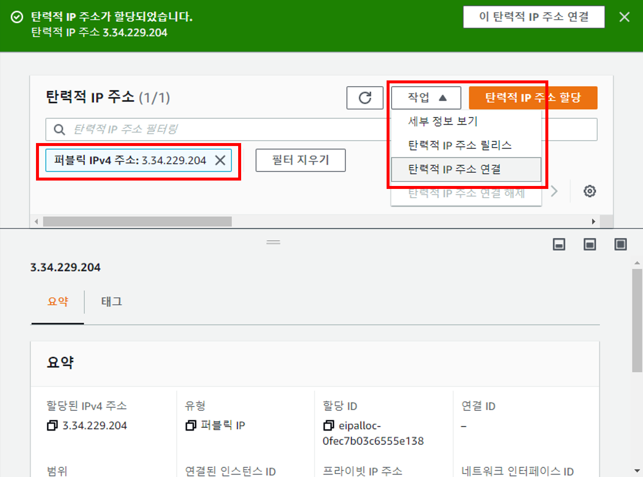 모든 옵션을 선택했으면 우측 하단에 [연결] 버튼을 눌러 탄력적 IP와 EC2 인스턴스를 연결해 줍니다.