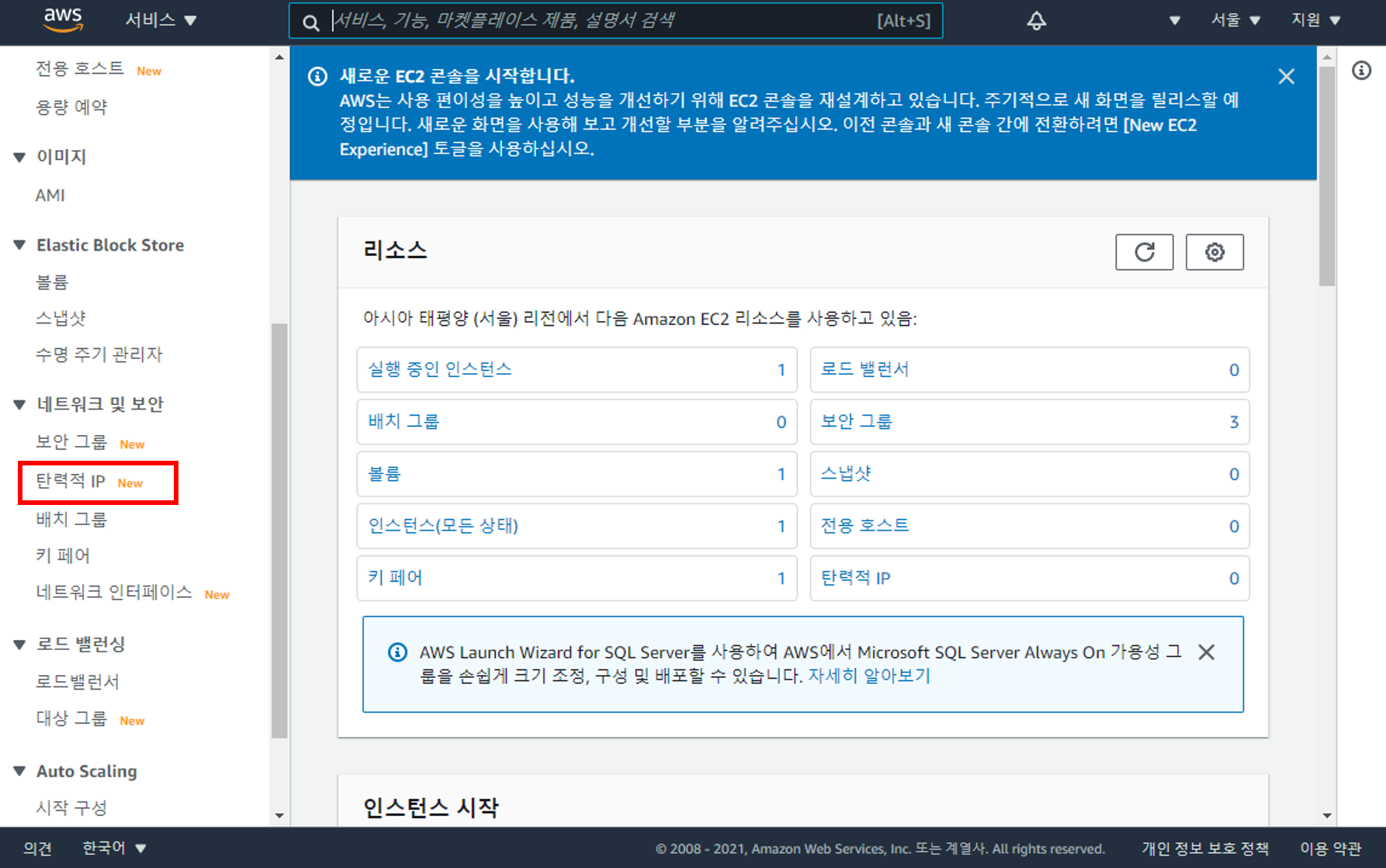 EC2 대시보드에서, 좌측 메뉴바에서 스크롤을 내리다 보면 [네트워크 및 보안] 섹션에서 [탄력적 IP] 메뉴를 확인하실 수 있습니다.