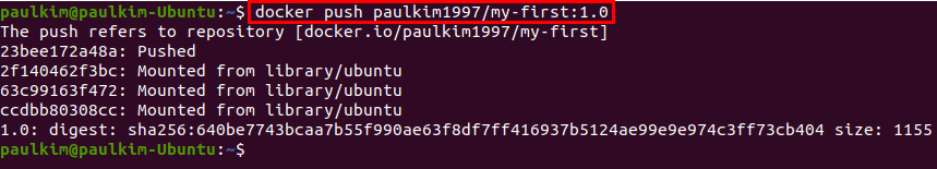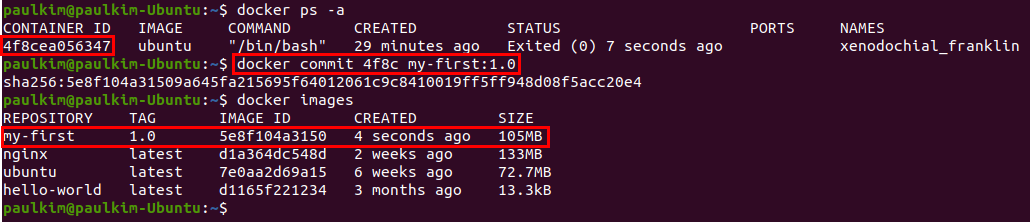 4f8c는 아까 생성한 컨테이너의 id이고, my-first는 생성하고자 하는 이미지의 이름, 1.0은 태그입니다.