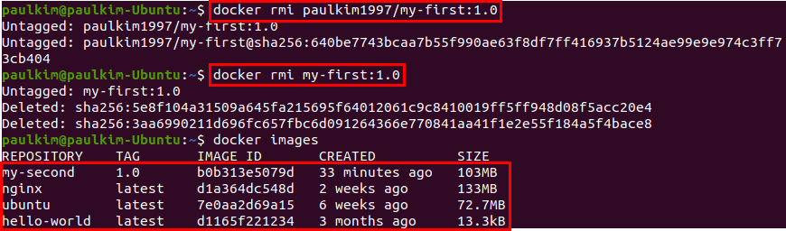 아래 실행 결과를 보시면, $ docker images 명령어로 이미지를 확인했을 때, 생성해준 my-first이미지를 확인할 수 있습니다.