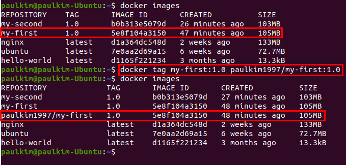 그리고 tag 명령어를 통해 업로드하고 싶은 이미지를 생성해줍니다.