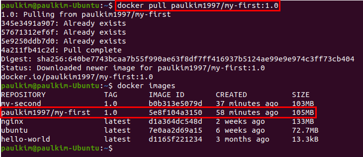 그리고 pull 명령어를 통해 이미지를 내려받아옵니다.