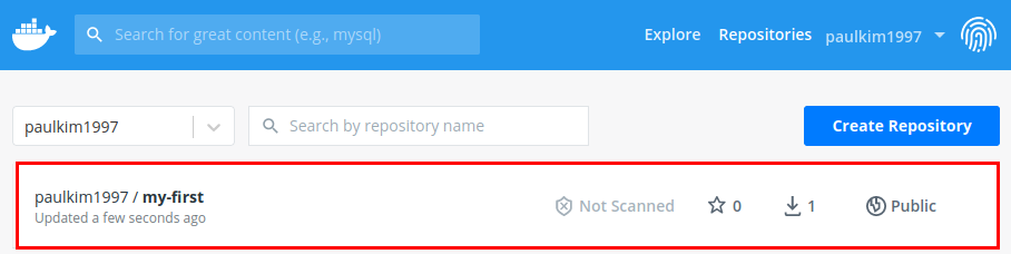 Docker hub에 들어가서 확인해보면 방금 push 한 이미지가 있는 것을 확인할 수 있습니다.