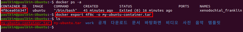 export : 컨테이너의 파일 시스템을 tar파일로 생성합니다.