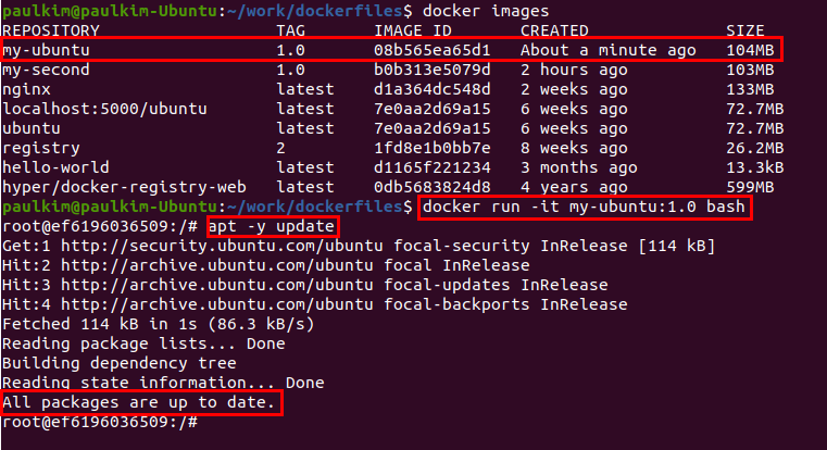 $ docker run -it my-ubuntu:1.0 bash 명령어로 해당 이미지를 실행하고 접근해서 apt -y update 명령어를 실행해보면, 모든 패키지가 up to date라고 이미 Dockerfile을 빌드하면서 apt -y update 명령어를 실행한 것을 확인할 수 있습니다.