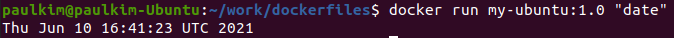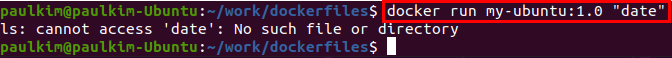 $ docker run my-ubuntu:1.0 "date"라고 명령어를 입력하면, CMD명령어로 설정한 ls -al이 date로 오버 라이딩됩니다.