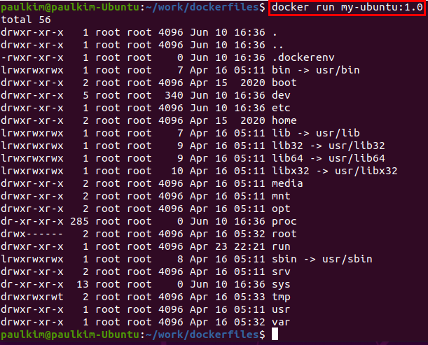 $ docker run my-ubuntu:1.0 명령어를 통해 해당 이미지를 실행해 보면, 다음과 같이 ls -al 명령어를 실행하고 종료되는 것을 확인할 수 있습니다.