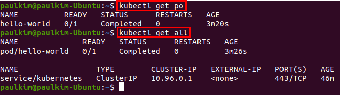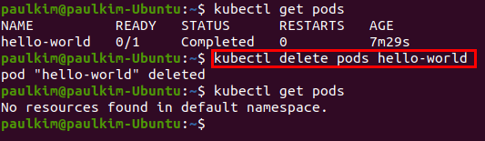 위 명령어의 뜻은 hello-world 이미지를 갖고 와서 hello-world라는 pod를 만들어서 한 번만 실행하고 끝내라 라는 의미입니다.