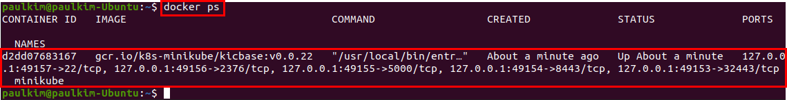 $ docker ps 명령어를 입력하면 아래와 같이 minikube가 실행 중인 것을 확인할 수 있습니다.