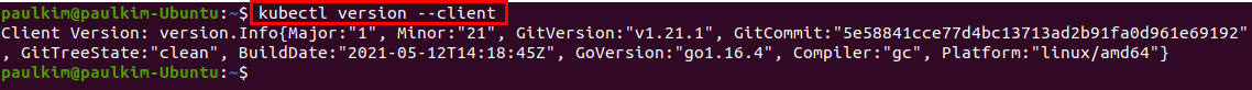 마지막에 다음과 같이 $ kubectl version --client 명령어를 통해 설치 확인을 해주면 설치가 완료됩니다.