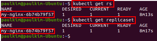이를 확인하기 위해 $ kubectl get replicaset 아니면 $ kubectl get rs 명령어로 replicaset을 확인해봅시다.