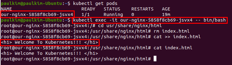 그럼 해당 웹 페이지가 방금 실행한 our-nginx deployment가 맞는지 nginx의 index.html 파일을 수정해 확인해보겠습니다.