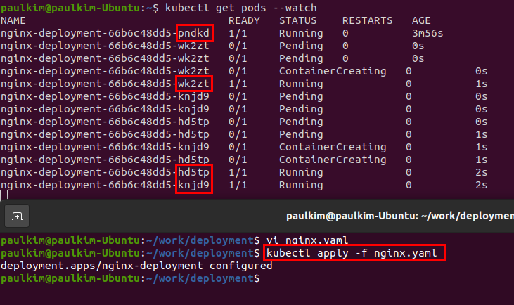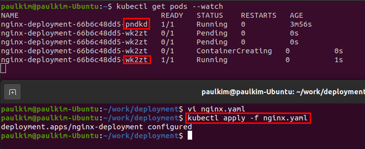다음 실행 결과처럼, 기존에 있던 pndkd의 아이디를 갖는 pod하나가 돌고 있었는데, replicaset의 크기를 2로 늘리고 apply 해주니 wk2zt의 아이디를 갖는 pod하나가 더 생겨 실행되면서 총 2개의 pod가 실행됨을 확인했습니다.