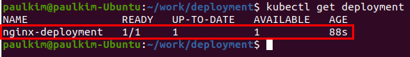 $ kubectl get deployment 명령어를 통해 실행 중인 deployment를 확인할 수 있습니다.
