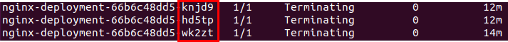 다음 실행 결과를 보면, 아까 있었던 pndkd, wk2zt의 아이디를 갖는 pod들을 제외하고, hd5tp, knjd9의 아이디를 갖는 pod들이 총 4개가 실행되고 있음을 확인할 수 있습니다.