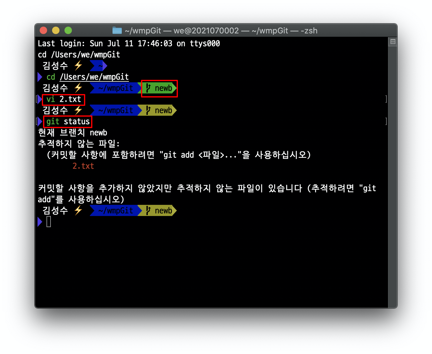 현재 branch는 newb branch이고, 2.txt 파일이 추적되지 않고 있다고 확인할 수 있습니다.