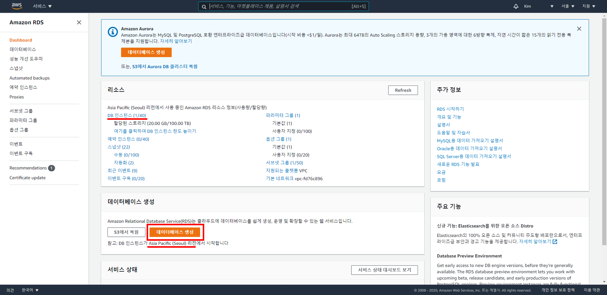 리소스, 데이터베이스 생성, 서비스 상태 등 정보를 확인할 수 있습니다. DB인스턴스를 하나 만들어 보았기 때문에 리소스 부분에서 "DB인스턴스 (1/40)"로 표기되어 있는 걸 확인할 수 있고, 데이터베이스 생성 부분에서 사전에 리전을 서울로 바꿔주어 적용된 것을 확인하고 "데이터베이스 생성" 버튼을 눌러줍니다.