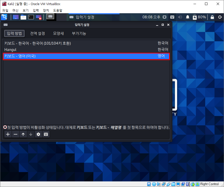 Kali Linux 설치하고, 한글이 깨져서 설정하고 나서도, 한글을 입력하고 싶어도 입력이 안되는 것을 확인할 수 있습니다.