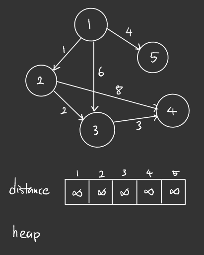위와 같이 방향 있는 그래프가 있고, distance 배열은 모두 무한대로 채워져 있습니다.
