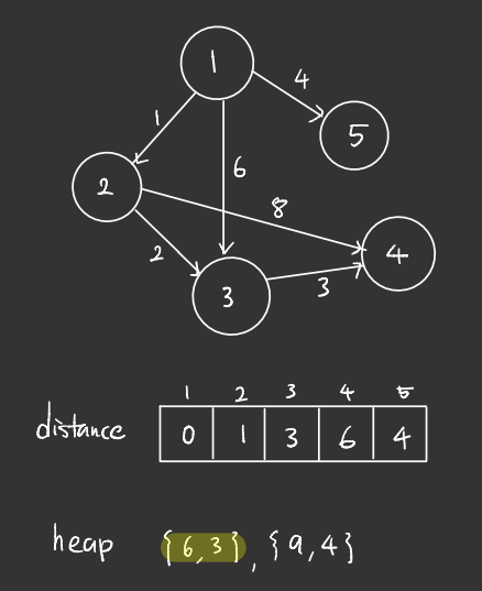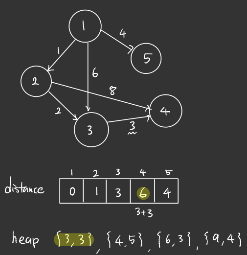 distance[3] == 3 이므로 힙에서 { 6 , 3 }을 그냥 제거해줍니다.