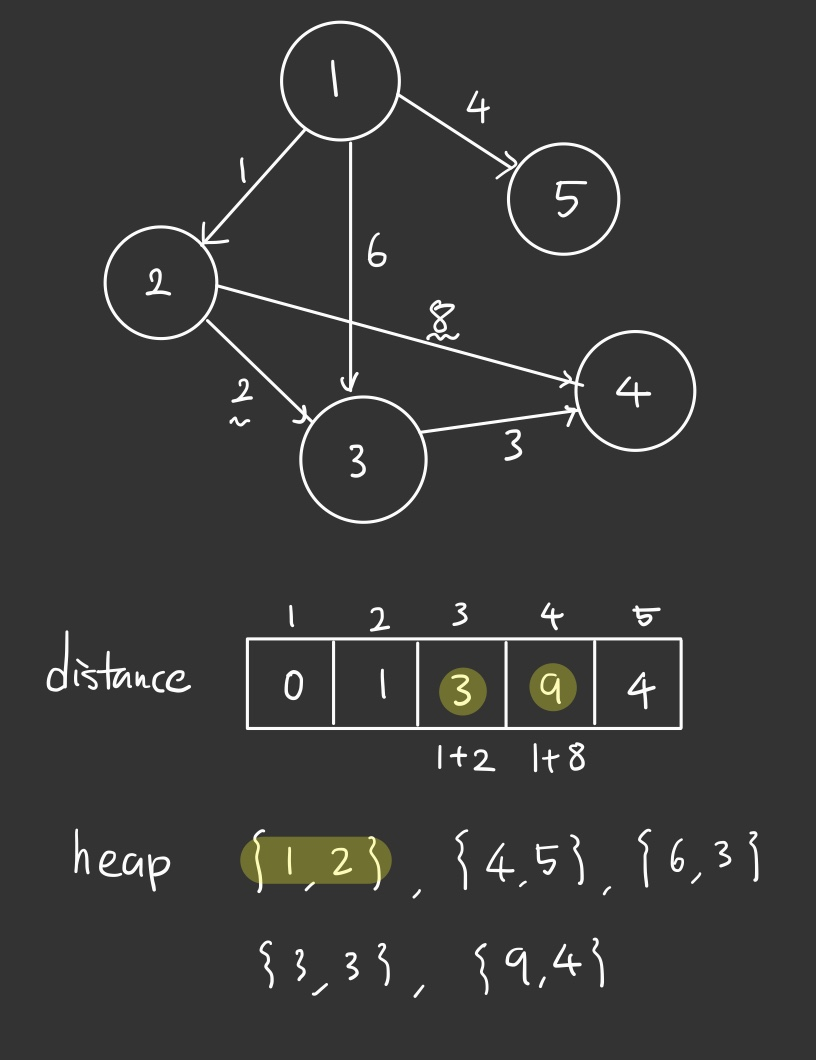 앞으로 힙에 넣을 { a , b } 쌍에서 a는 거리, b는 정점을 의미합니다.