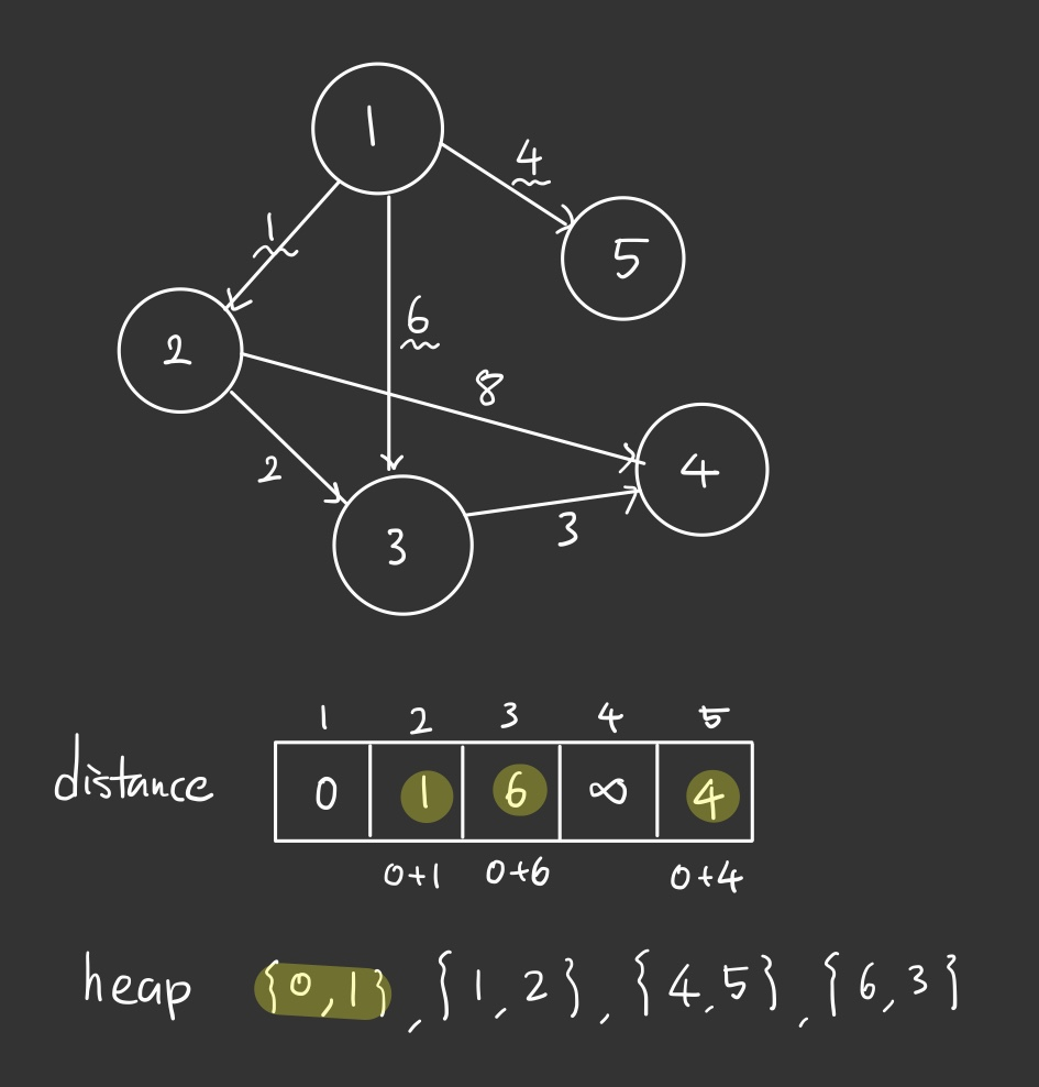 distance[1]이 0이 아니라면 { 0 , 1 } 은 힙에서 그냥 제거해줍니다.