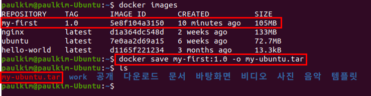 save : 이미지를 tar 파일로 생성합니다. docker hub에 있는 이미지들처럼 layer들을 모두 저장합니다.